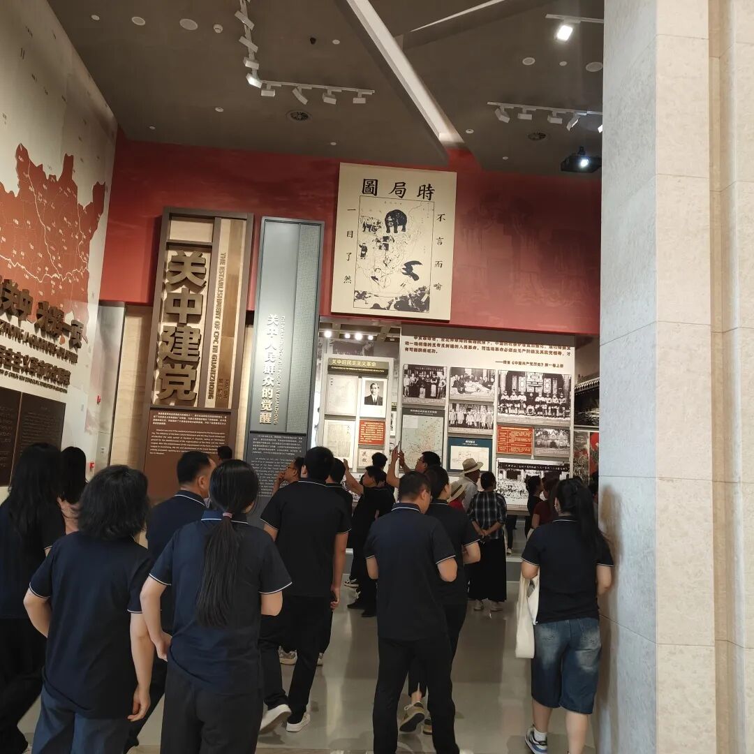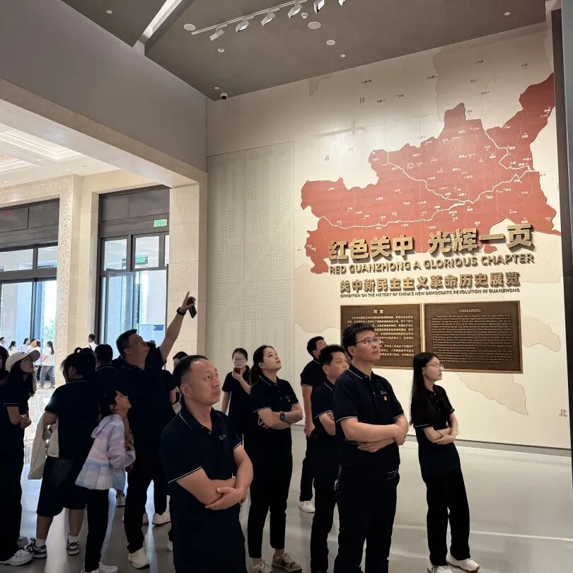 在富平县城中心的关中革命纪念馆,党员们沿着历史脉络穿梭于展厅之间。关中革命历史展区以实物、影像与场景复原,再现了这片土地作为关中革命根据地核心区域的斗争历程;多媒体沙盘演示《富平战役》全息投影时,光影交织中仿佛能听见当年的冲锋号角。全体人员在纪念馆前庄严合影,让历史的厚重与现实的担当在镜头中定格。